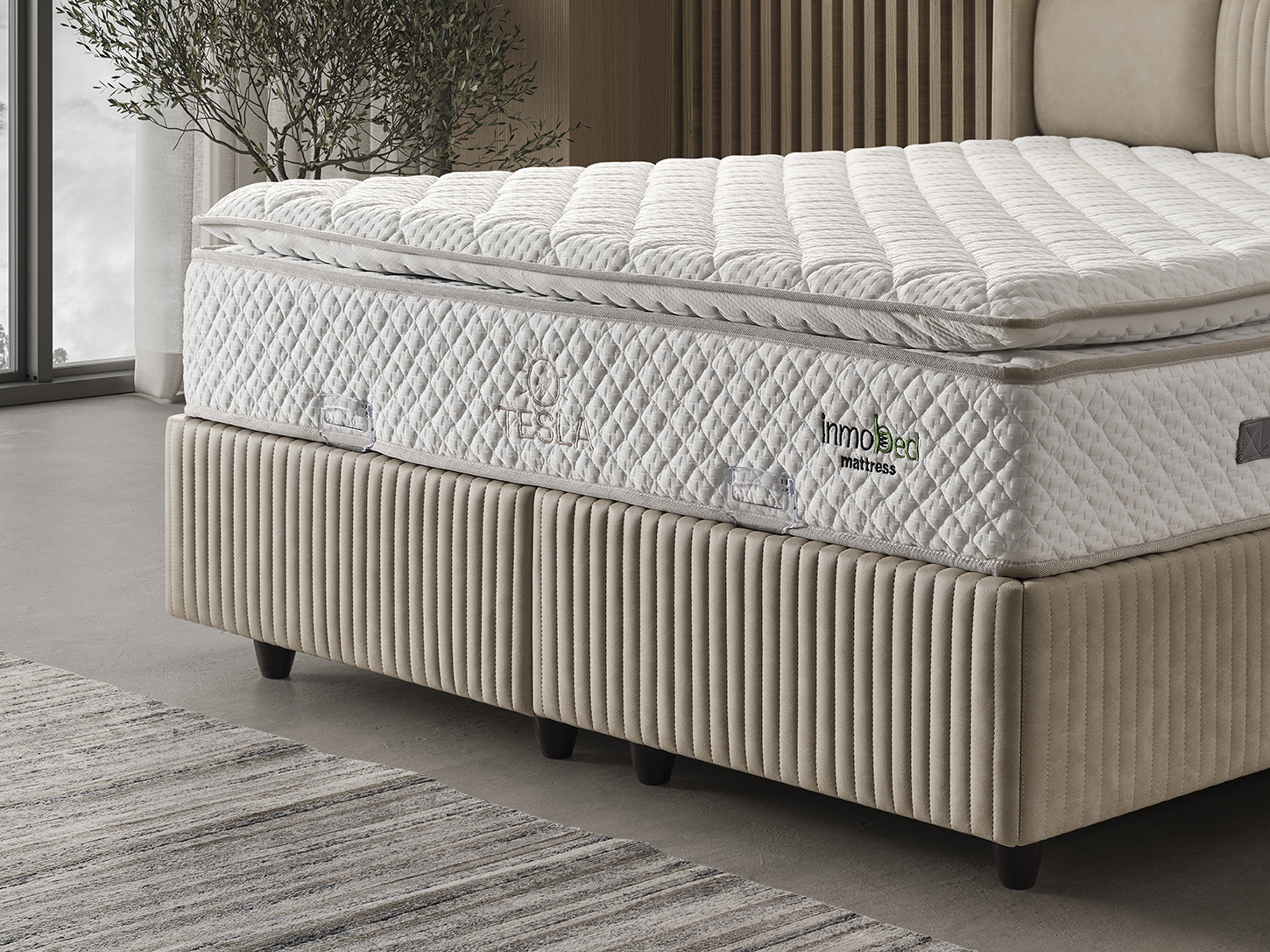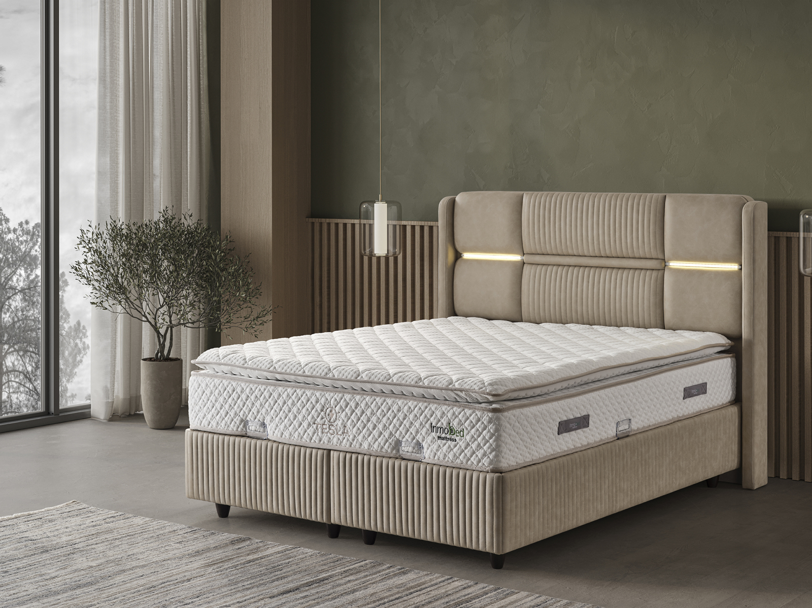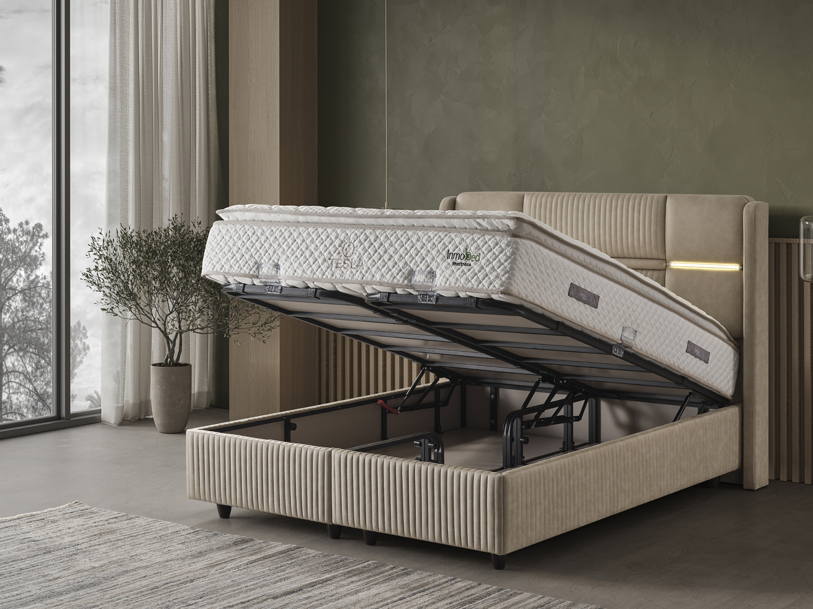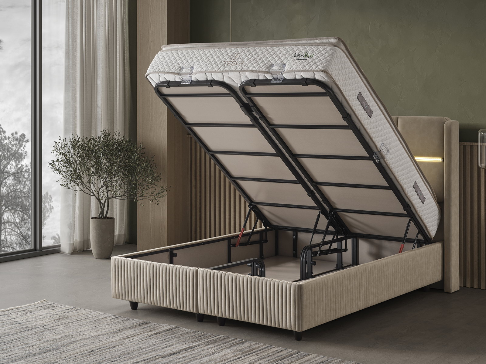 Patul Tapitat Tesla de la Mobila Star Design este o piesă de mobilier elegantă și funcțională, concepută pentru a îmbunătăți confortul și organizarea dormitorului dumneavoastră.